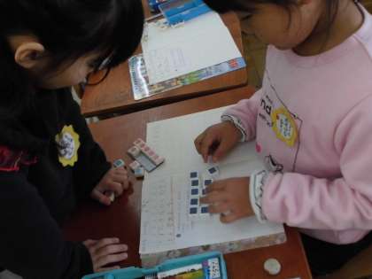 数図ブロックを動かしながら話し,ノートに書いて残しています。2年生に向けて少しずつレベルアップしています!!