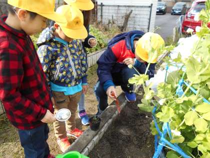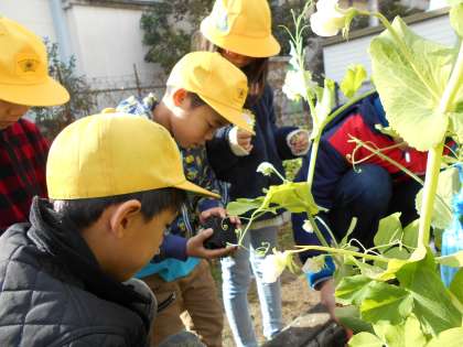 今日はパクチーをポットから畑に植えかえたり,スナップエンドウを収穫したりしました。