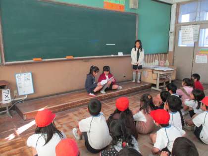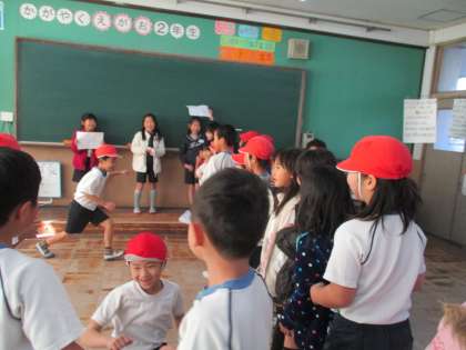 「大切係」が劇をしました。友だちとの関わりで,よい振る舞い,良くない振る舞いの2パターンを劇にし,みんなに考えてもらうというものでした。以前児童会の子どもたちが行った人権劇を参考にしているものだと思うのですが,とても完成度が高く,クラスの子どもたちもとても楽しんでいました。12月と1月と2回劇をしました。(写真は12月のものです)