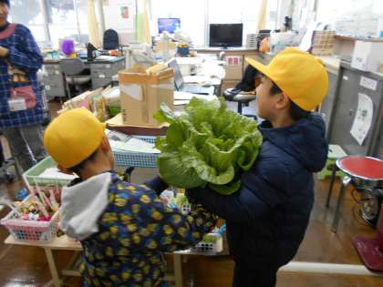 白菜が取れた喜びを,職員室でも報告です。