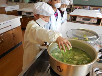 コンロに火をつけ,白菜を茹でます。