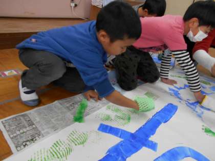 ローラーでコロコロしたり,ストローで吹き流しをしたり,でこぼこ素材の紙を使ってすタンピングをしたり,思い思いに色を塗っていきます。