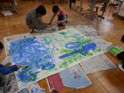 みなみおたのしみ会に向けて,魚つりゲームで使う海をみんなで作りました。