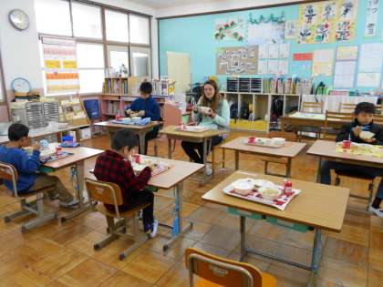 ALTのモンタナ先生が交流給食に来てくれました。