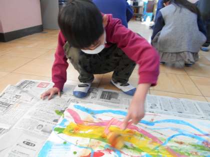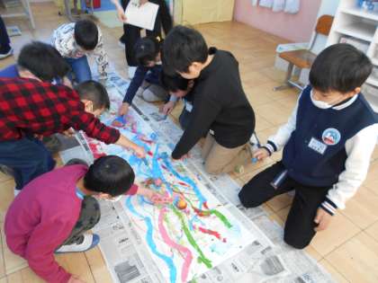 色々な色の絵の具をローラーにつけ,みんなでコロコロ。