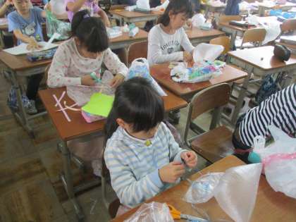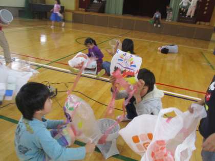 図工「ふんわりふわふわ」では,ビニール袋を使った作品をつくり,送風機でふわふわととばして楽しむ学習をしました。みんなとても楽しそうにかざりつけた袋をとばしたり,ふくらませたりしていました。