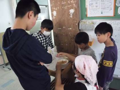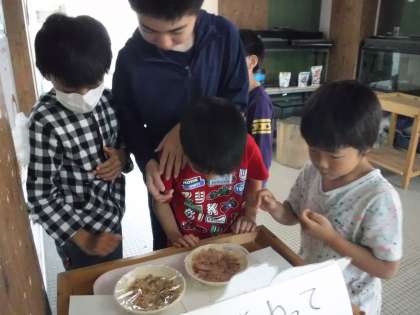 給食室の前にかつお節と削り節が入ったお皿が並んでいました。