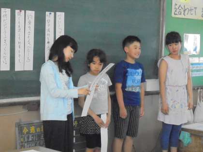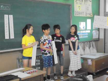 SNSを使うことで起こるトラブルに巻き込まれないように話し合い,発表しました。