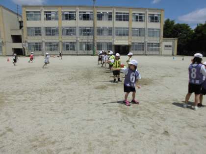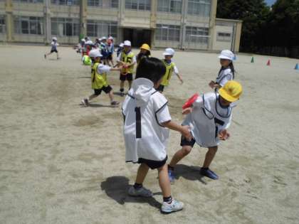 順番やバトンの渡し方をチームごとに相談しながら,対戦していました。