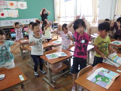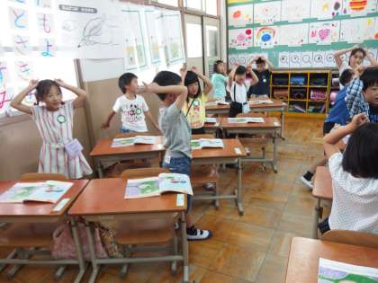 かたつむりの目玉を指で表現しながら,拍に合わせて歌うこともできました。