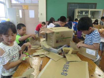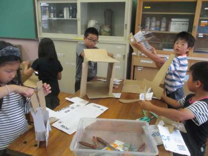 図工「クミクミックス」では,段ボールを組み合わせて造形遊びをしました。切込みをいれたり,穴をあけてはさみこんだりして,ボンドやテープを使わずに作品を作ります。それぞれに楽しんで組み合わせていました。中には,班で協力して大きな作品をつくっているところもありました。