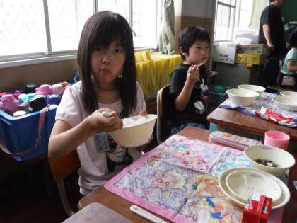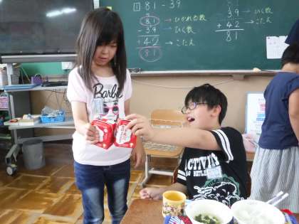 交流学級で給食です。