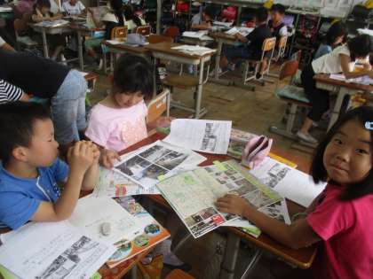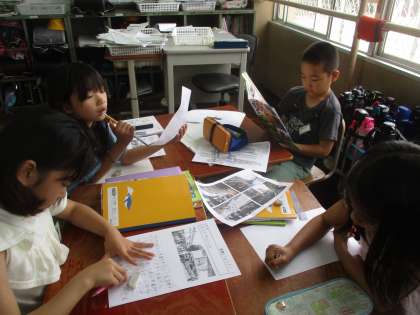 京都駅・四条河原町の様子について,パンフレット,写真,ビデオ,地図などで調べました。たくさんの資料をとても興味津々で見て,色々と気が付いたこと,分かったことをどんどんまとめていました。