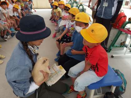 動物のふれあい体験では,テンジクネズミを触りました。動物園の職員さんの話を,しっかりと聞いています。