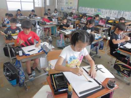 書写の学習では,「はらい」に気を付けて学習をおこないました。左はらいは「だんだん弱く」,右はらいは「だんだん強く」と,力のいれかたに気をつけて一生懸命「大」という字をかきました。