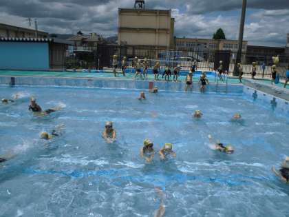 とても良いお天気で「水あそび」ができました。水慣れでは,カニさん動き・ロケット・けのびなどをしました。友達とバディを組み,教え合いました。また,自分に合った練習方法を選んで,ビート板などを使って泳ぎました。