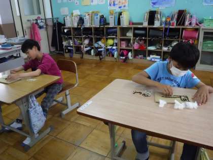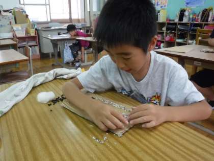 朝顔の種,小石,綿を使って作品を作りに挑戦しました。