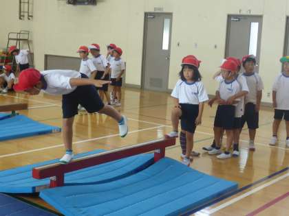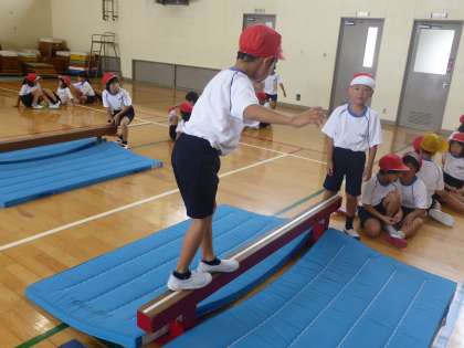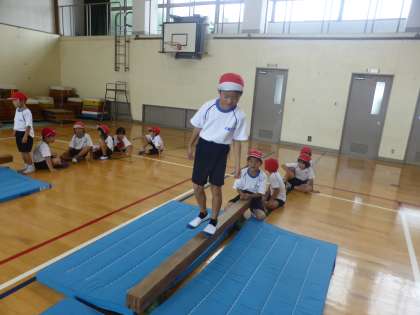 平均台でいろいろなポーズやわたり方に挑戦しました。片足ポーズや1回転ターンなどを組み合わせながら,遊び方を工夫しました。