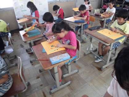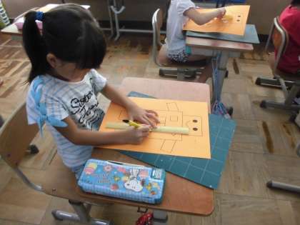 図工科では,窓の形や開け方を考えてカッターナイフを使いました。カッターナイフの安全な使い方をおさえ,集中して紙を切る活動ができました。参観日では,自分で考えて切って,できた窓を開いて,作品を作っていきます。