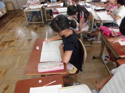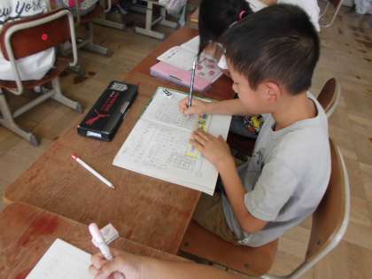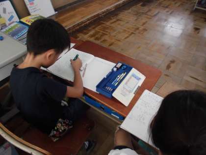 3つの数のひっ算の仕方を学習しました。くらいをそろえて3だんに書いています。繰り上げを忘れずに,間違わずにがんばっています。。
