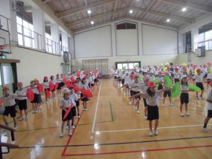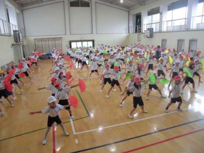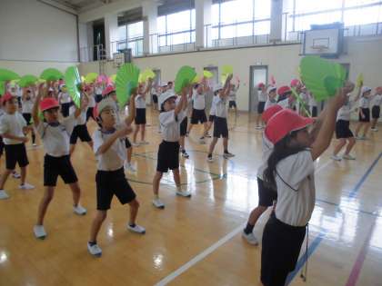 運動会練習3日目です。扇子の持ち方が上手になってきました。「バサッ」と息を合わせて扇子を広げる姿がとても素敵です。