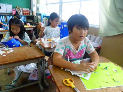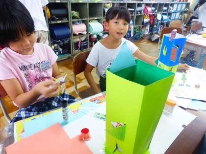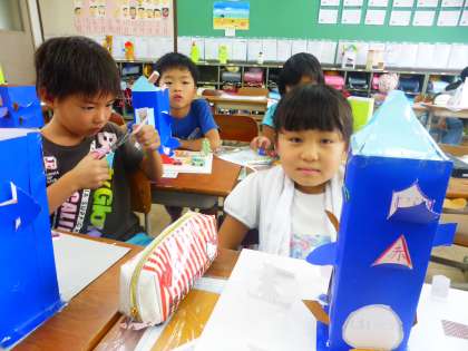 作った窓から,考えた好きなものが出てきます。少しずつ自分たちのまちが仕上がってきました。