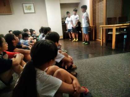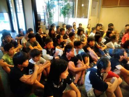 2日目、「朝のつどい」です。全員元気です。今日も1日、みんなで協力してすばらしい思い出を作ってくださいね。