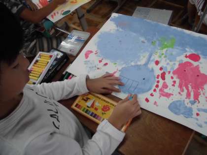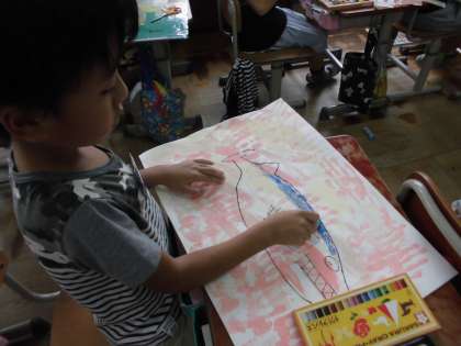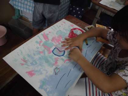 とろとろえのぐで自由に描いた画用紙に,パスやペンで絵を描きたしました。