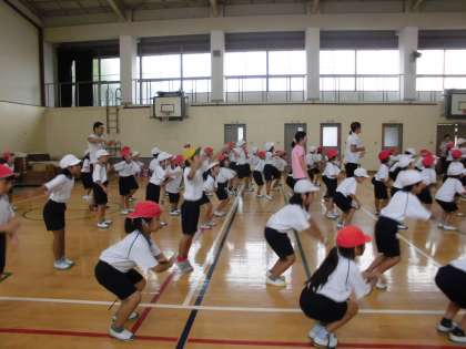 今日は,雨だったので,体育館で練習しました。向きや手の挙げ方など揃える練習をしました。