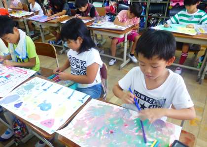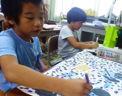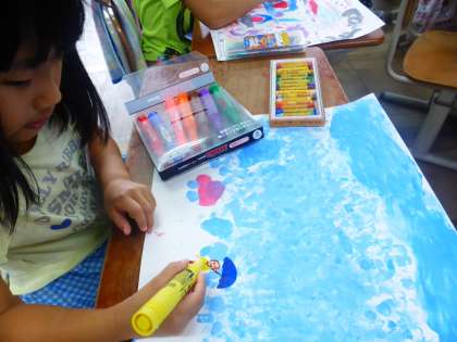 とろとろ絵の具で描いた画用紙に,上からパスやカラーペンを使って書き加えました。