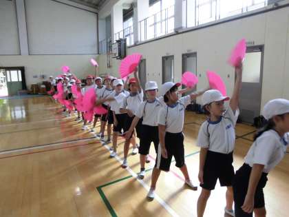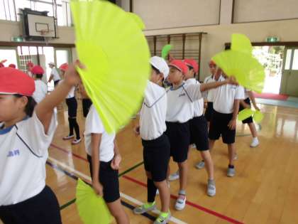 今週はダンスのふりも全部覚えてやる気いっぱいの中学年です。クラスごとに1列になって順番に扇子を広げたり,カウントに合わせて扇子を出したりと難しいふりにも挑戦しています。