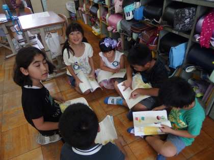 動作を付けて発表しようと,グループで相談しながらがんばっています。