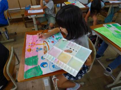 図工では現在,聞いたお話を絵に描く学習をしています。