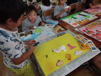 お話の絵が完成に近づいてきました。コンテで色をぼかしたり,パスの塗り方を変えたり,思い思いに色付けしています。