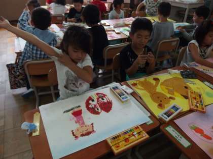 腕まくりしたり,立ったりしながら,細かいところを丁寧に塗ろうとしている子もいました。机の向きや,大勢も思い思いに描いています。