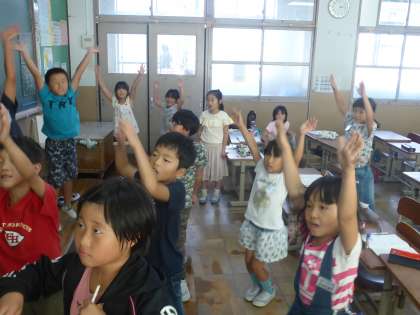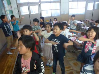 運動会に向けて,赤組・白組の応援歌を覚えています。
