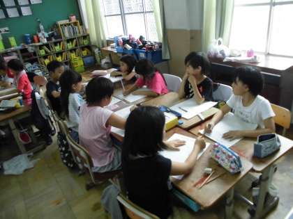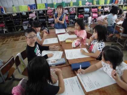 次は,同じ行先にいく1組2組のグループが合体をして,話し合いをしました。