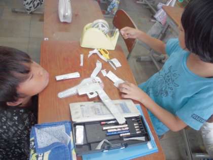 そのほかにもみんなに披露するお笑いのために,紙で鉄砲をつくっていたり,ビンゴをしていたりと,みんな思い思いに休み時間を過ごしています。