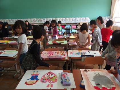 最後にもう一度,みんなの作品を見て回りました。お気に入りのところを聞いてから,見ると,また見方が変わりますね。