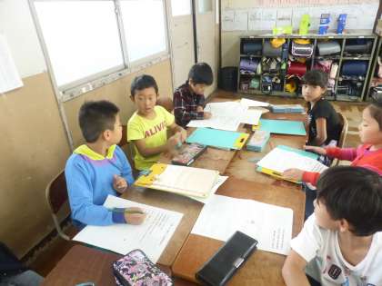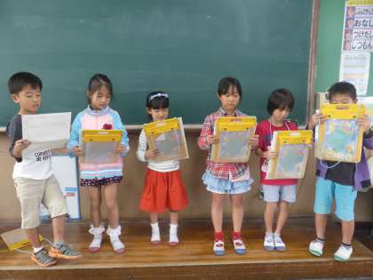 18(木)の町たんけんでは,お店などに行ってお店の人にインタビューをします。今日は,グループに分かれてインタビューの内容を考えたり,質問をする練習をしたりしました。