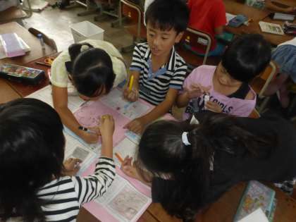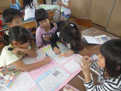 生活科「町の大好き伝えたい」では,町たんけんに行ってインタビューしてきたことをポスターにまとめました。また,お世話になった方へ感謝の気持ちもお手紙に書きました。