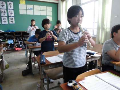 音楽の学習では「スタッカート」を学習し,音を短くきるように吹く練習をしています。リーコーダーを演奏する時は,姿勢もとても大事です。