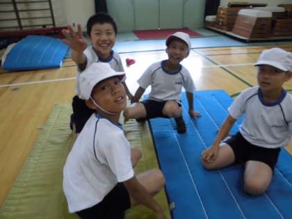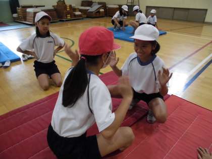 体育の学習では,すもう遊びの学習をしています。しゃがみ相撲やけんけん相撲,バランス相撲など頑張っています。