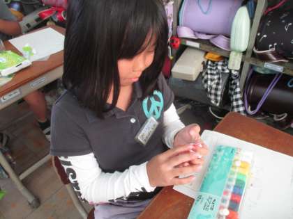 「ハッピー小物入れ」の学習では,どんな小物入れにするかアイデアスケッチをした後,ねん土に絵の具を混ぜて,色付きのねん土を作りました。次回そのねん土を使って小物入れを作るのを楽しみにしていました。
