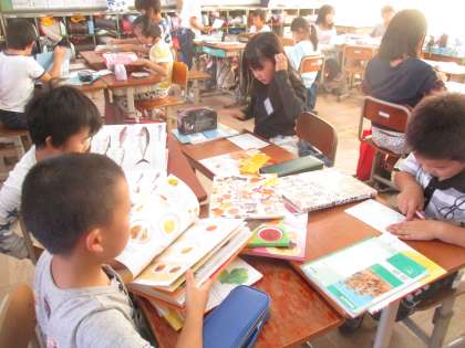 堀本先生が,本での食べ物のひみつを調べる授業をしてくださいました。「食べ物のひみつを教えます」の授業で調べたことが生きてきます。みんなたくさんの食べ物のひみつの本を興味津々で食い入るように見ていました。