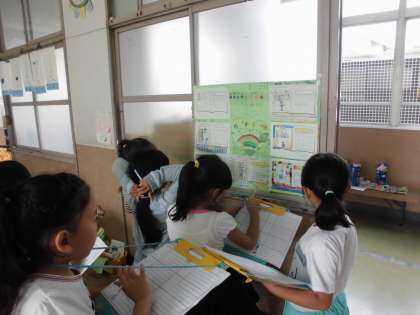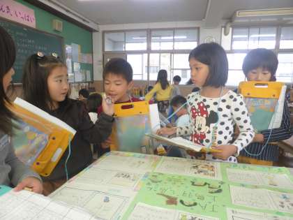 生活科では,町探検を通して分かったことや考えたことを伝え合う学習をしました。お店などでインタビューしてきたことや分かったことをポスターにして,見合っています。
