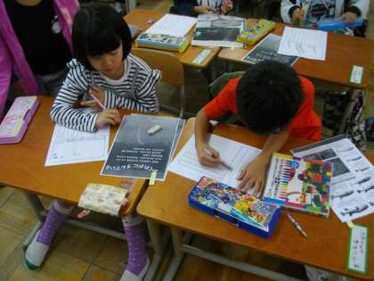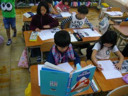 子どもたちは,調べた生き物をカードに一生懸命に書いていました。