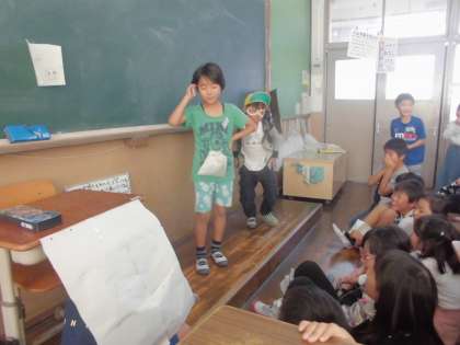お笑い係の「サンドイッチマン」が「ドラえもん」という題でお笑いを披露してくれました。スペアポケットや,タケコプターなど紙からできた不思議道具がいっぱい登場しました。みんなをお笑いの渦に引き込んでくれた「サンドイッチマン」。次回公演が楽しみです。