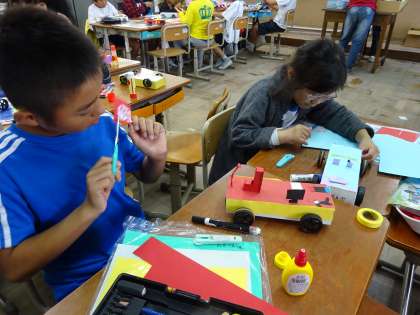 図工の授業では,ゴムの力で動く車を作っています。