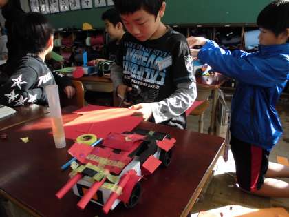 図工の学習でゴーゴードリームカーをつくっています。どのような工夫したら速く走れるのか。工夫しながら作りました。